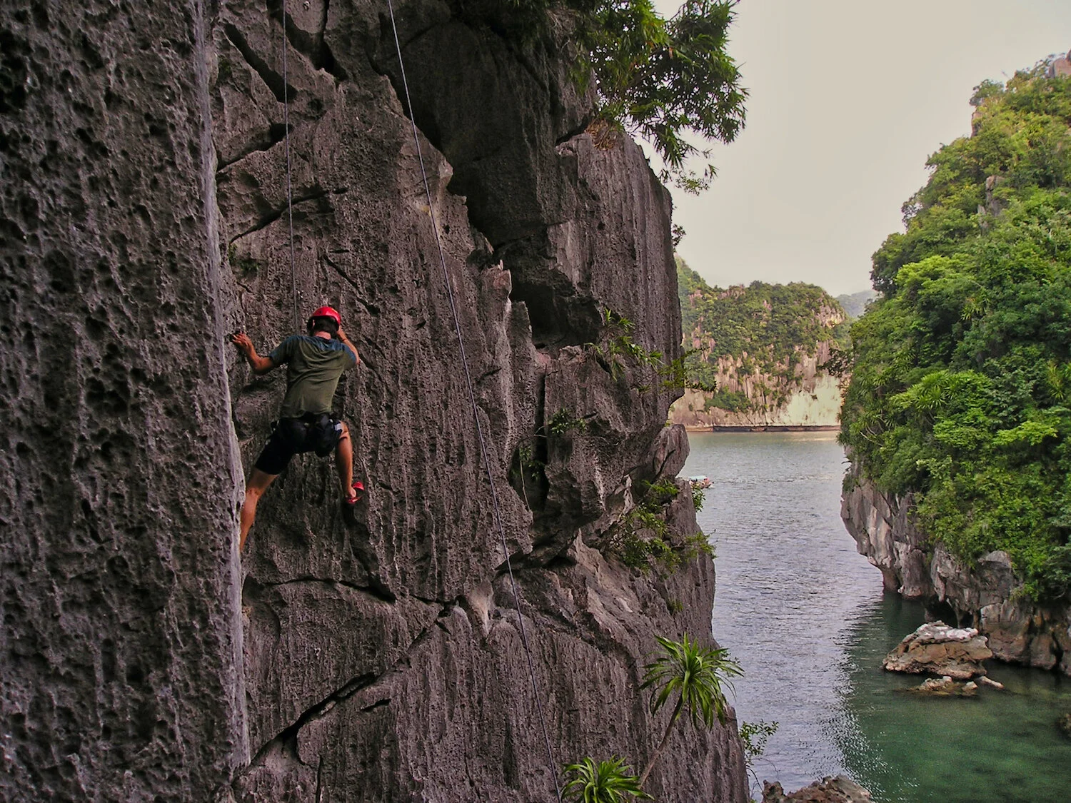 There was a notable exception. Lan Ha and Ha Long are famous for rock climbing. The only thing better than staring at limestone karsts is scaling them. This held no interest for Michelle, and watching me fumble my way up a cliff is no way to spend a morning, so we split up the band for the day. She chilled poolside; I embarrassed myself on the rocks. I wasn’t there for the epic climbs. It was the scenery that drew my attention. All else was bonus material. With competent guidance, any idiot can have a go.