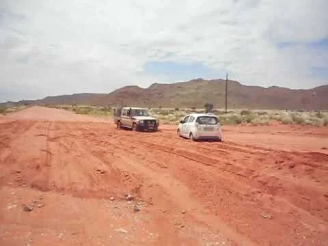 We had our sights set on Sesriem, situated on the edge of the Namib desert, just a few hundred kilometers away. The distance seemed doable, but who were we kidding? We drove down dusty roads for hours on end, before getting into a sticky situation. Our little Spark was no match for the soft, water-soaked sand, and became lodged while passing through a washed out portion. On all fours, we attempted to dig our way out. Yeah… that worked well; real well. So well, that I soon found myself trotting across a game farm in search of assistance. Not smart. It wasn’t until I lost sight of Rich that I started to get antsy, wondering what kind of ‘game’ might be lurking ahead. I pictured myself getting trampled by a rhino or eaten by a lion. Sometimes my imagination gets the best of me… probably more often than not.